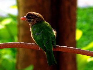 A couple of White Cheeked Barbets (also known as Small Green Barbets - Megalaima Viridis) frequent the trees just outside my workplace, and they are a treat to watch from the window, and helps me take the little breaks that are necessary sometimes. I could finally capture them through the camera lens, and here are a few shots: